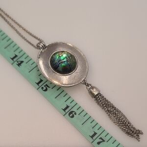 Keywords: Lucky Brand, reversible necklace, abalone, mother of pearl, MOP, iridescent, shell, silver tone, long pendant, tassel necklace, adjustable length, slider chain, boho chic, bohemian, unique jewelry, versatile, statement piece, pre-owned.
