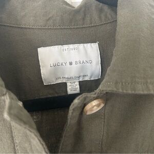 Lucky brand army green jacket with collar and front pockets. Tan buttons for closure. Great layer for fall, winter, and spring. Military style. Linen blend.