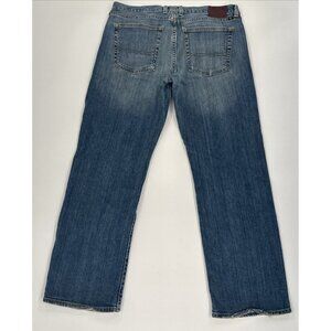 Lucky brand denim 361 straight jeans, men's size 34x30. True to size. Good overall condition with back ankle hem fraying and dark spots/stains on front left thigh area. Smoke free/pet free. Please review all photos for details with measurements, and ask any questions. Most orders are shipped out daily so expect a QUICK DELIVERY!