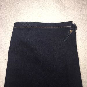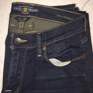 Dark wash Lucky Jeans! Fit super well and are extremely comfy. Stretchy material and straight leg cut. There is a very tiny rip on the bottom of the jeans, I included a picture of the rip. Also included internet photo of the Jeans, but mine are a darker wash.