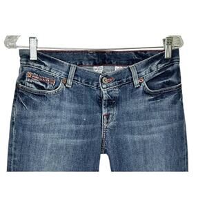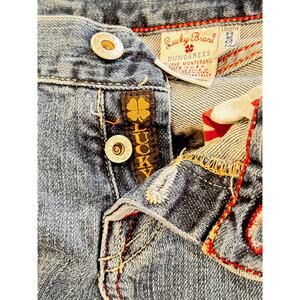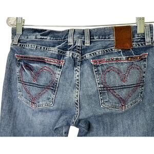 Lucky Brand Jeans Vtg Sweet Love Bootcut Leg Low Rise Medium Wash Wmns 8/29 Button Fly. Red contrast stitching including red hearts on the back pockets. Actual measurements taken flat:
