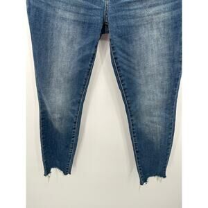Ava skinny medium wash blue denim mid rise jeans. Raw hem, factory fading, pockets. Cotton blend denim.