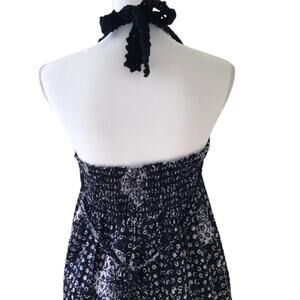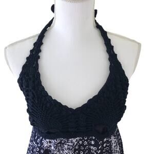 Navy blue and white boho maxi dress w/ crochet halter top. Crochet upper bodice is fully lined. Skirt is lined halfway down. Slight ruffle on the bottom. Tie at neck and tie at waist. Back is smocked and stretchy.