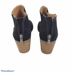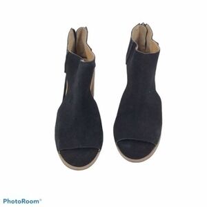 Lucky Brand Keight black suede booties. Black suede upper. Back zipper closure. Round peep toe. Cushioned footbed. Rubber sole