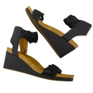 Lucky Brand “Kierlo” Wedge Sandals, Macramé Heels, Ankle Strap, Comfort Shoes, Moroccan Blue, Size 9.5. Preowned. Some scuffs on the wedge areas and wear on the bottoms. Heel height measures approx 2.5”. Cushioned footbed. Side zippers. Woven straps with dimensional geometric shapes make this platform-wedge sandal a standout vintage-chic style. By Lucky Brand.