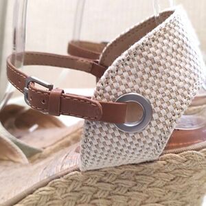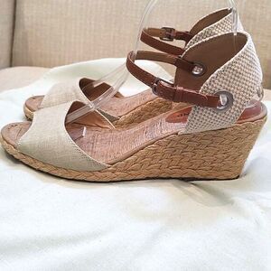 Lucky Brand Kyndra Open Toe Jute Espadrille Wedge Sandals. These sandals feature a brown leather ankle strap, gold metallic and white woven heel, gold metallic linen open toe, and a braided jute wedge. 1/2" platform and a 2" heel height. Size 9.5M.