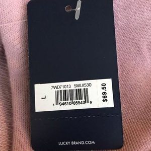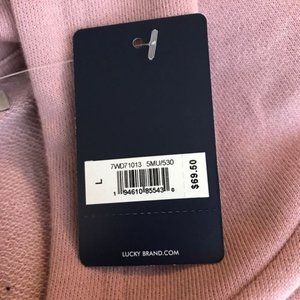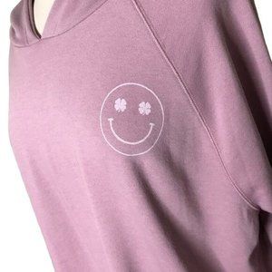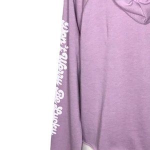 Dusty lavender “Don’t Worry Be Lucky” French terry hoodie sweatshirt. Unfinished hem.