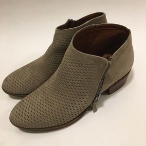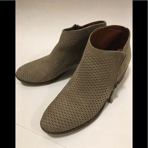 Lucky Brand BRIELLEY Perforated Ankle Bootie Taupe Nubuck SUEDE In excellent condition Heel Style:block/chunky 1 3/4" heel; 3" shaft Side zip closure Leather upper/synthetic lining and sole, worn once/no box. sides for easy on/off, suede upper. Super cute boots!!True to size. An asymmetrical topline adds an intriguing counterpoint to the orderly grid of perforations on a suede bootie lifted by a low, stacked heel. Toe style: closed toe. Leather upper/synthetic lining and sole No trades