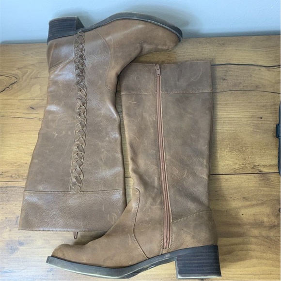 Lucky Brand LP Hatlewx Leather Riding Knee Tall Boots Wheat Winter Haze Cognac