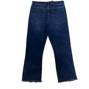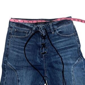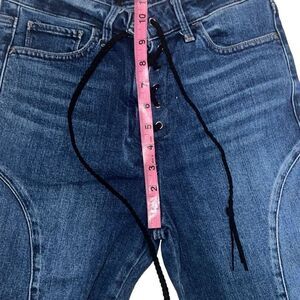 Good, preloved condition. Lucky Brand Lace Up Bridgette Crop Flare Raw Hem Denim Jeans Orta Premium Sz 4 / 27. Dark wash. Front seams.