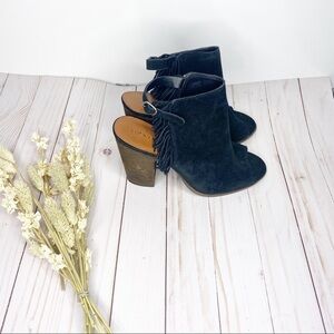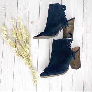 Fringe bootie, heeled suede bootie, peep toe, western boho heeled sandal