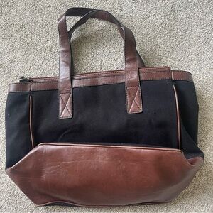 Lucky Brand Large Tote Bag Black Canvas/ Brown Leather Interior Pockets Zip NEW!