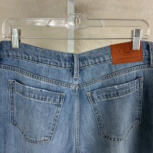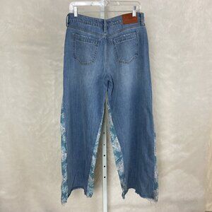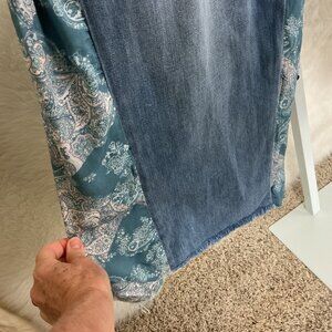 This is a pair of pleat front, super wide leg, pink & blue paisley floral insert, fray hem, distressed pocket jeansfrom Lucky Brand x Laura Ashley. Cotton, tencel, linen denim. Viscose insert. No flaws.