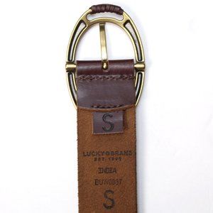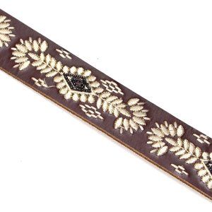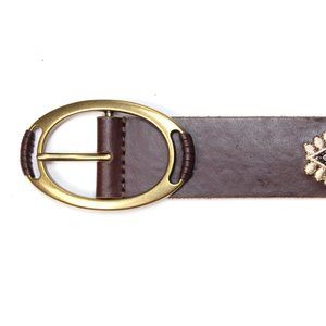 Lucky Brand Leather Belt Brown Cream Embroidery Black Beads Brushed Gold Buckle
