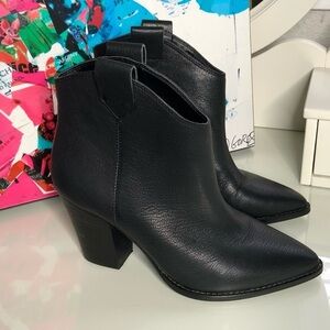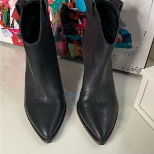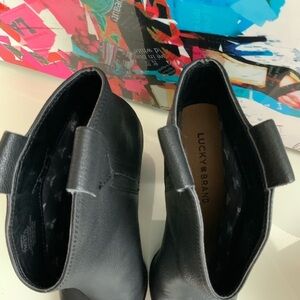 Just enough to add a very wearable Western touch to your jeans, skirts and dresses. These leather Lucky Brand western-inspired boots feature a pointed toe. Western-inspired cowboy boots or booties . Leather upper with a subtle texture Pull-on style with tabs on sides Pointed toe Hidden interior side panel with stretch to make putting them on easier Ditsy floral interior lining 2.5” heel Black colour Size 7.5
