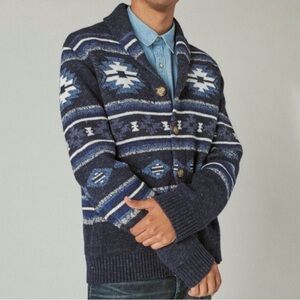 Lucky Brand Legacy Shawl Collar Button Front Cardigan Blue Aztec Print Size M