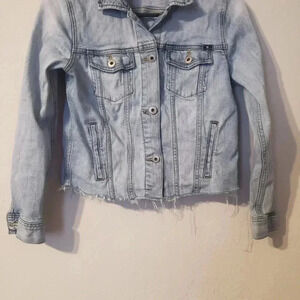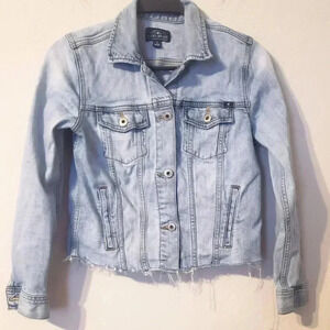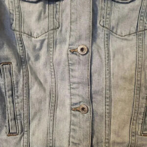 Stylish light blue jean jacket. Features button closure. Two chest pockets. Classic design.