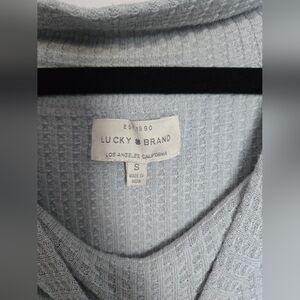 This Lucky Brand sweater is a stylish off-the-shoulder waffle knit design in a light blue-gray color. With long sleeves and a regular fit, it's perfect for casual occasions during the winter, fall, and spring seasons. Made from machine-washable knit fabric, this sweater is both comfortable and easy to care for. The size is medium (M) and it features a solid pattern, making it a versatile addition to any woman's wardrobe.