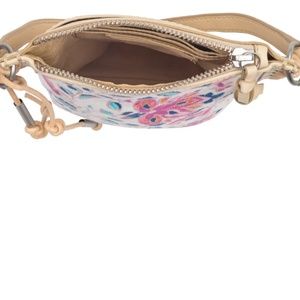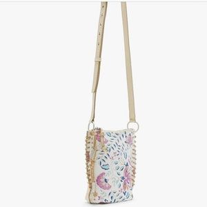 From Lucky Brand comes this vibrant boho floral pattern detail small crossbody. Features 46" strap, top zip closure, leather exterior, polyester lining. As functional as it is fashionable with whipstitching accent, Silvertone hardware, 1 exterior slip pocket