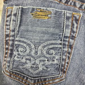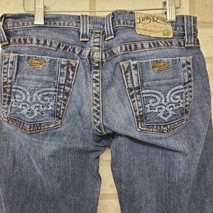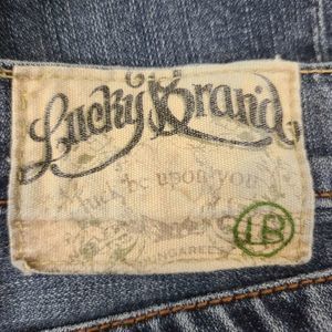 Rare Lucky Brand bootcut jeans. They have intentional distressing including the partial hem. Classic 5 pocket closure. The jeans have belt loops and a 2 button closure. One button is hidden. Rivets and buttons have the signature Lucky shamrock engraved on the back side.
