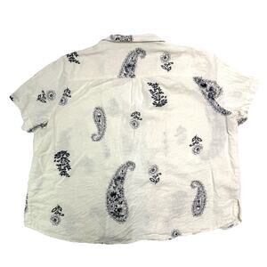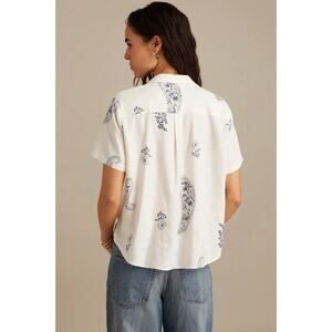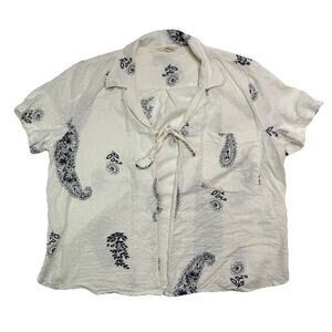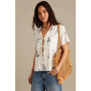 Lucky Brand Linen Tie Front Shirt Cream/Blue Floral Short Sleeve Large ONE TIE
