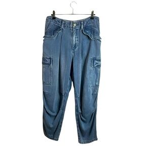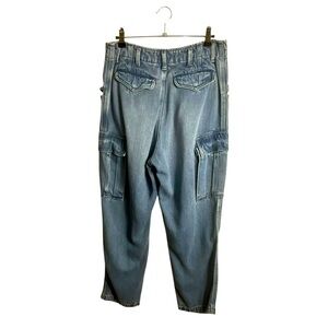 Lucky Brand Liquid Denim Luxe Cargo Jeans Trendy blue denim cargo jeans with a relaxed fit. Features multiple pockets for convenience. With button and zip fly, front snap flap pockets, belt loops, two side snap cargo flap pockets, two snap flap back pockets, craft it with Tencel, a naturally soft and lightweight fiber made from the wood pulp of trees, sourced from responsibly managed forests