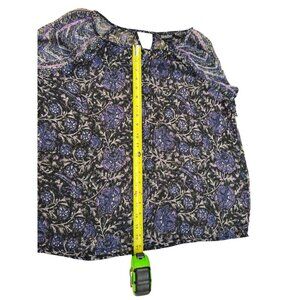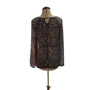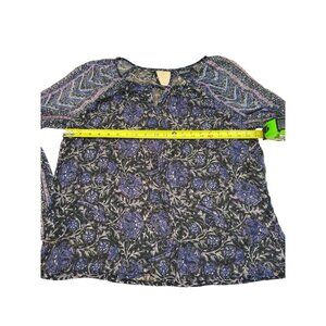 The Lucky Brand Live in Love Women's Sz L Sheer Blouse is a boho peasant style top featuring a geometric pattern in blue color. This long sleeve blouse with a keyhole closure and casual sleeve type offers a regular fit and is machine washable. Perfect for all seasons, this tunic-style blouse with a sheer feature adds a touch of love-themed charm to any wardrobe. Made in India, this blouse is a stylish and versatile addition to your collection of women's clothing.