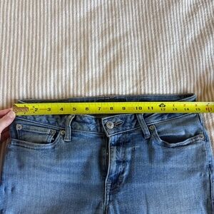 Raw hem mid rise skinny jeans. Runs slightly large (4-6). No rips. Slightly discoloration on waistband - see photos. Offers welcome