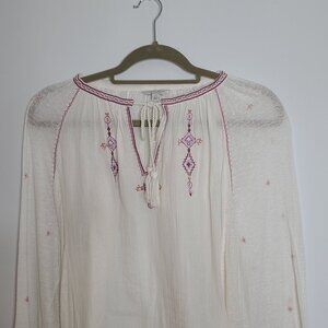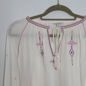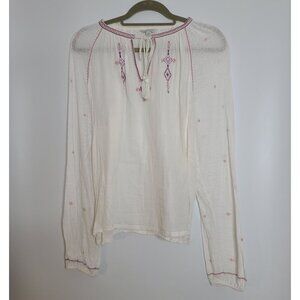 Lucky Brand Long Sleeve Peasant Boho Embroidered Blouse Tassel Tie Size Large