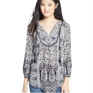Lucky Brand Long Sleeve Tie Front Boho Top Black/White Design Small