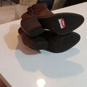 Lucky Brand Loxona dark brown suede leather side zip ankle bootie size 6.5 NWT. almond toe with stacked 3 1/4" heel. western style. color most resembles actual pics of boots