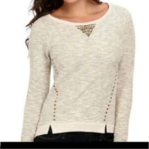Lucky Brand Lotus embellished long sleeve pullover knit sweater. French terry cream knit fabric with subtle golden metallic threads throughout, antique gold studded neck detail and asymmetrical studded sides.