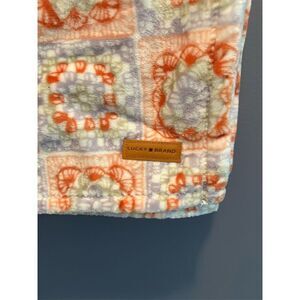 The Lucky Brand throw blanket is crafted from premium microfiber, offering a luxurious feel. It features a printed multicolor design with primary colors of orange, purple, and white. Measuring 50x70 inches, this blanket is ideal for adding a touch of style to any bedroom. Suitable for adults, it can be used for cozy evenings or as a decorative piece. The item is new with tags.