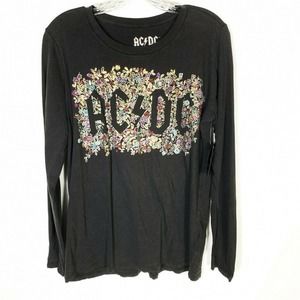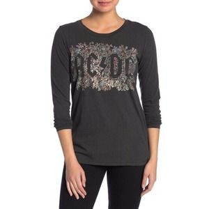 Lucky Brand Black Acdc Floral Tee Long Sleeve Gray Gold Metallic T shirt Band Rock