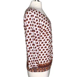 Gathered v-neck tee with adorable button details down the arms. Elastic handed bottom.