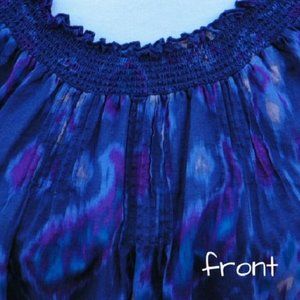 Purplish blue cotton top with trendy details, including gathered bottom with dual drawstrings and pintuck pleats below smocked neckline.