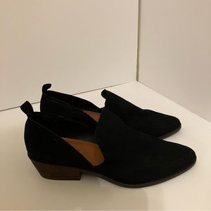 Black suede leather upper Slip on style loafer Curved side cutouts Closed, pointed toe Brand new Size 8.5