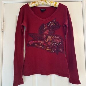 Lucky Brand Maroon Waffle Knit Tee | Size S | 90s Y2K Style Boho Long Sleeve