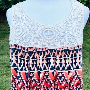 Lucky Brand Maxi Dress L Geometric Print Crochet Summer Vacation Party Bright