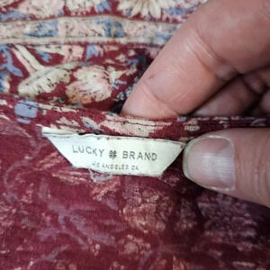 Lucky Brand women’s blouse in a beautiful red floral boho print. Features bell sleeves and peasant-style cottagecore 70s vibes.