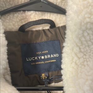 Stylish bomber jacket by Lucky Brand. Rich brown with a cozy cream collar. Perfect for cool days.