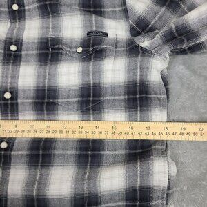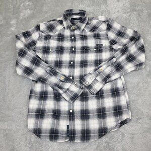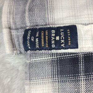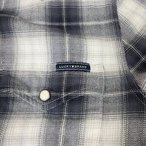 The product is a Lucky Brand men's button-up shirt in a size Small, with a classic fit and long sleeves. It features a red check pattern with a multicolor design, and closure is done with pearl snap buttons. The shirt is suitable for casual wear and is part of the men's clothing collection. Designed for regular sizes, this black shirt offers a stylish and comfortable option for everyday wear.