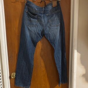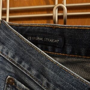 Dark blue slim jeans with classic five-pocket style. Durable denim for everyday wear.