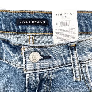 Lucky Brand Men’s Athletic Fit Denim Cut Off Shorts. Style #7M13371 DRIW/450 Driftwood . According to Lucky Brand, these shorts are specially designed for athletic builds. Frayed cut off hem. Front is embellished with holes that have been repaired with stitching and patches on the inside of the jeans. Light abrasion details throughout. Mid-rise athletic fit. Zip fly, shank button closure, 5-pocket styling. 2-way stretch. 99% cotton, 1% elastane denim fabric.