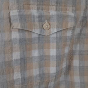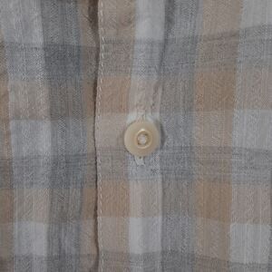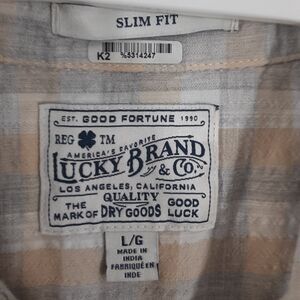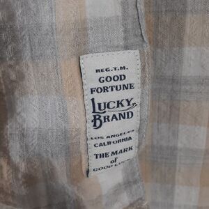 Up for sale is a stylish Lucky Brand men's shirt with a gray, white, and beige plaid pattern. This shirt is perfect for casual occasions and features a short sleeve, spread collar, and button closure. It is made of a comfortable cotton blend material that is machine washable and easy to care for.