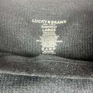 Lucky Brand Men's Gray Waffle Knit Long Sleeve Sleepwear Shirt, size Large. This comfortable sleepwear shirt features a distinctive bear graphic on the front, adding a touch of outdoor-inspired style. Made from a soft cotton and polyester blend, ensuring warmth and breathability. Excellent pre-owned condition with no significant flaws. Perfect for lounging or a casual night in.