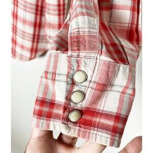 Lucky Brand Mens Pearl Snap Button Up Shirt Western Rodeo Red White Plaid Cotton