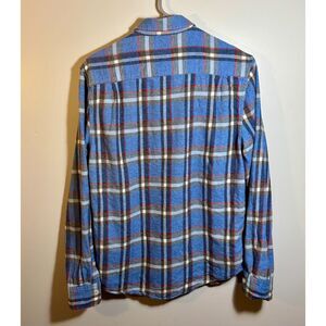 Pre-owned Lucky Brand men’s flannel shirt in a blue, gray, red, and white plaid pattern. Lightweight yet soft, perfect for layering or casual wear.