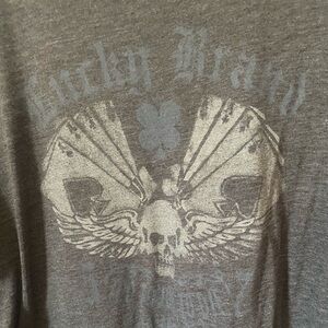 Casual and edgy Lucky Brand men’s graphic t-shirt in size XL. Features a distressed skull with wings and shamrock design on a soft gray fabric. Perfect for everyday wear with jeans or layered under a jacket for a rocker-inspired look.