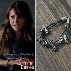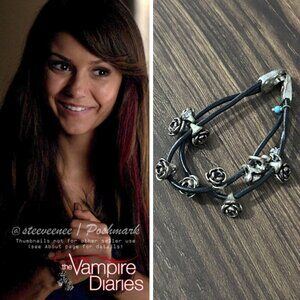 Lucky Brand Metal Rose Leather Bracelet as seen on Elena Gilbert (Nina Dobrev) in The Vampire Diaries season 5 episode 2. Same style, brand and color. Screen accurate, not screen worn.